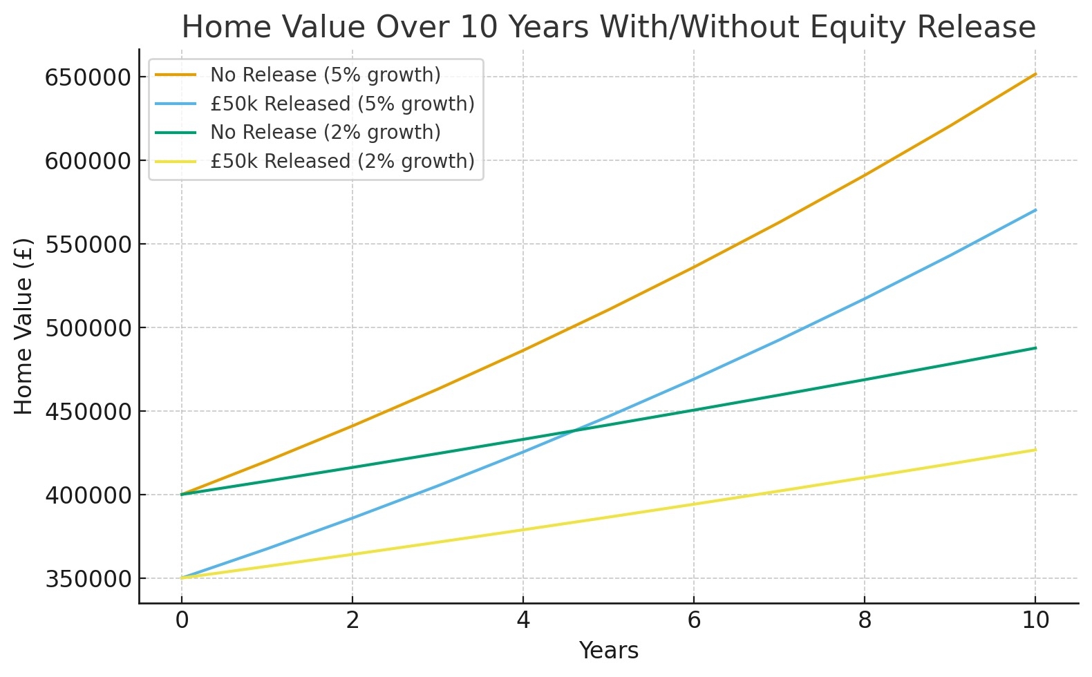 Now assume house prices rise say 5 % a year for the next 10 years. The £350,000 grows to about £570,000. Meanwhile, had you not released the £50,000, your home would’ve started at £400,000 and grown to ~£640,000.