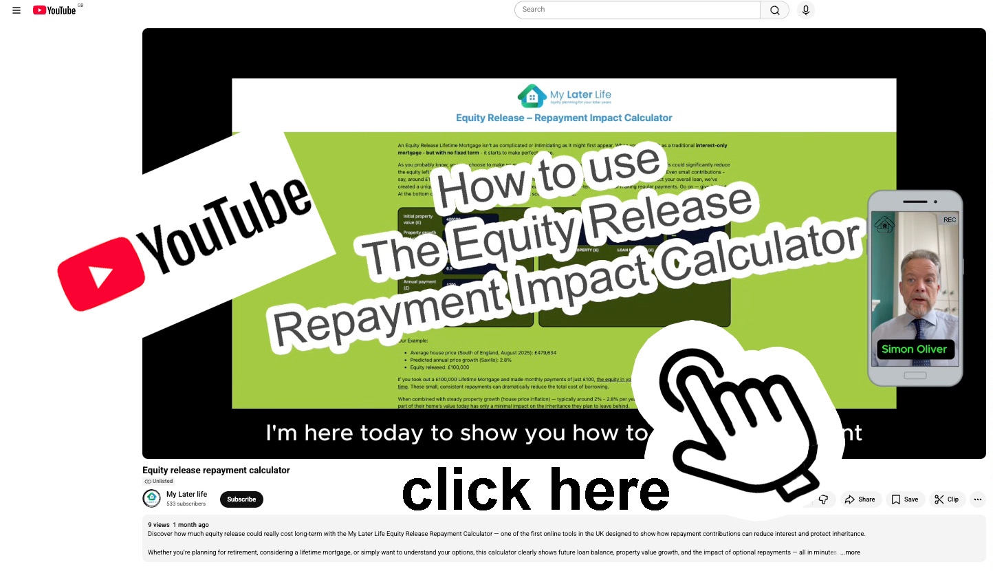 In short: My Later Life’s online Equity Release Repayment Calculator brings clarity to a complex decision. By showing exactly how repayments, interest, and property growth interact, it empowers you to unlock cash from your home , without sacrificing the future you hope to leave behind.